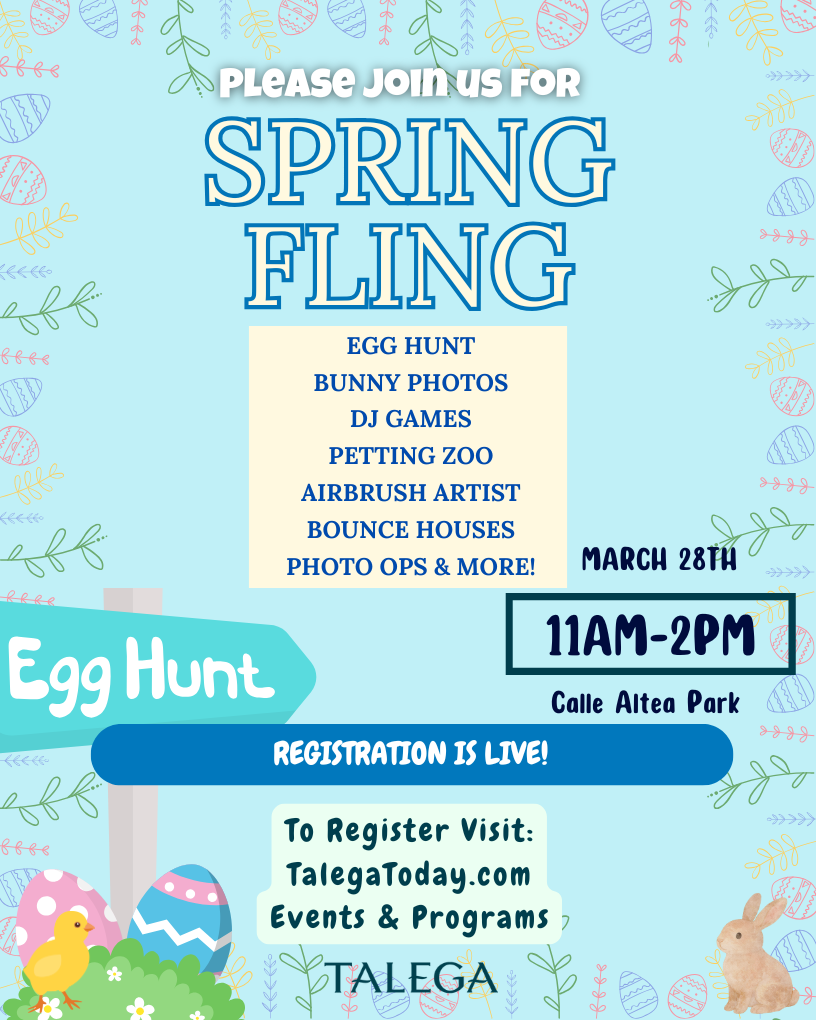 Celebrate the season at Spring Fling! Join us on Saturday, March 28th from 11AM–2PM at Calle Altea Park for an egg hunt, bunny photos, games, bounce houses, and more family fun. Click HERE for more information!