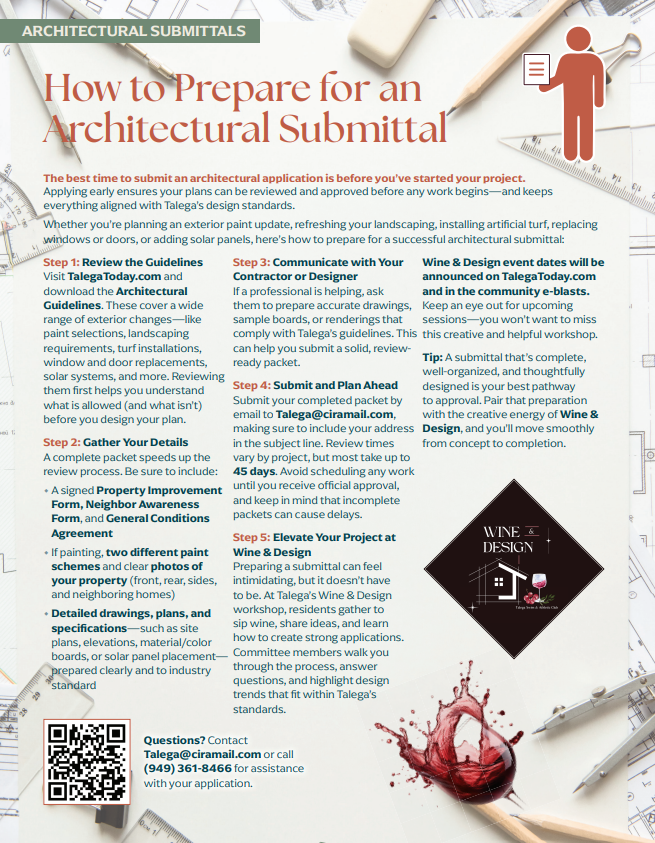 The purpose of these Architectural Guidelines is to preserve and improve the physical character as established by the initial development of the community of Talega. The intent is to give specific design criteria to Owners for subsequent improvements after the completion of original construction. The Design Review Committee will generally require owners to comply with the Architectural Guidelines, however, depending upon circumstances, the Design Review Committee may approve an owner’s proposal that does not strictly conform to those Guidelines if the Design Review Committee determines that the purposes of the Guidelines would still be achieved in a particular instance without requiring strict conformance to the Architectural Guidelines.
