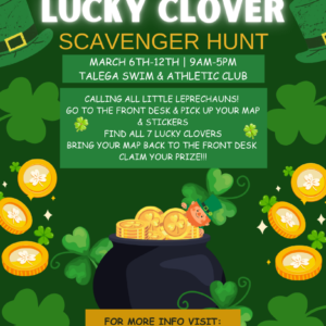 Lucky Clover Scavenger Hunt Join us on March 6th-12th from 9AM-5PM at the Talega ... 06 Mar 9:00 AM - 12:00 AM Talega Swim & Athletic Club