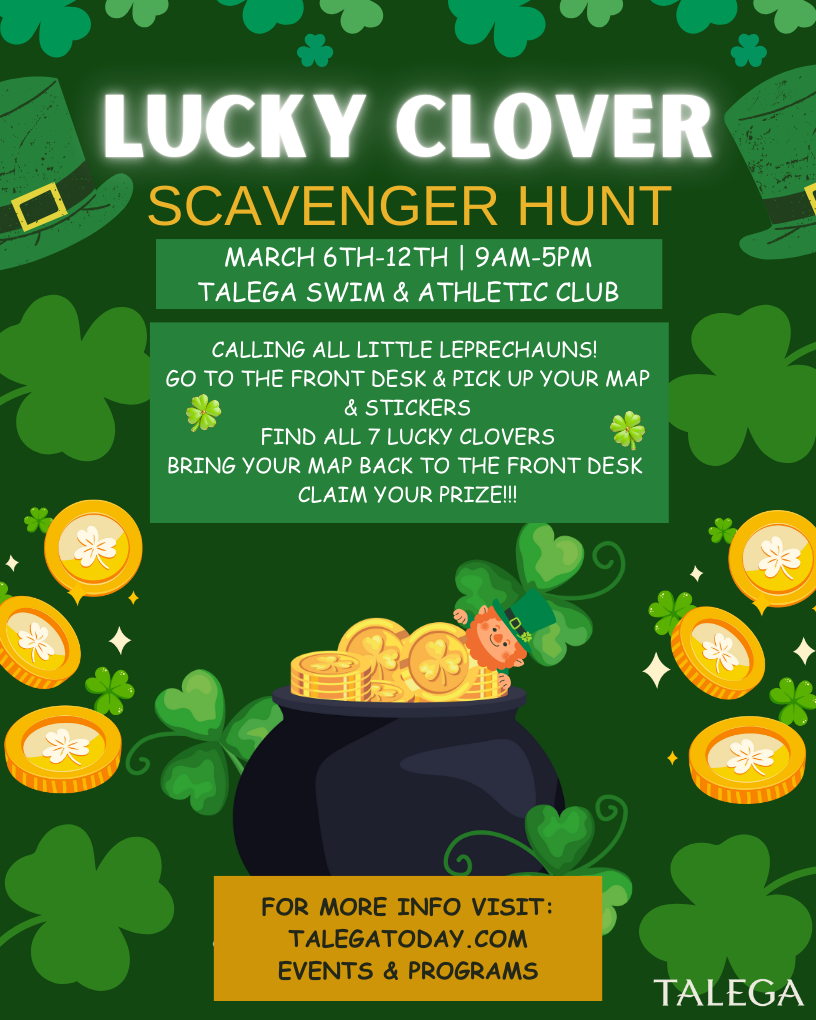 Lucky Clover Scavenger Hunt January 21, 2026 Payton Cantrell Join us on March 6th-12th from 9AM-5PM at the Talega Swim & Athletic Club for our Lucky Clover Scavenger Hunt!… Continue Reading →